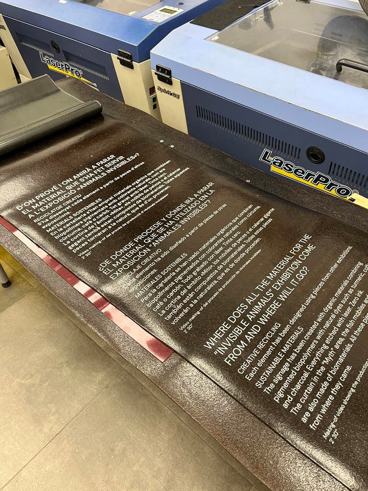 - El sistema de señalética CIBICO®, producido con ingredientes naturales como café, carbón, cochinilla o cúrcuma, grabado con láser para evitar el uso de tintas. El resultado: texturas únicas y colores orgánicos que demuestran el potencial de estos nuevos materiales.