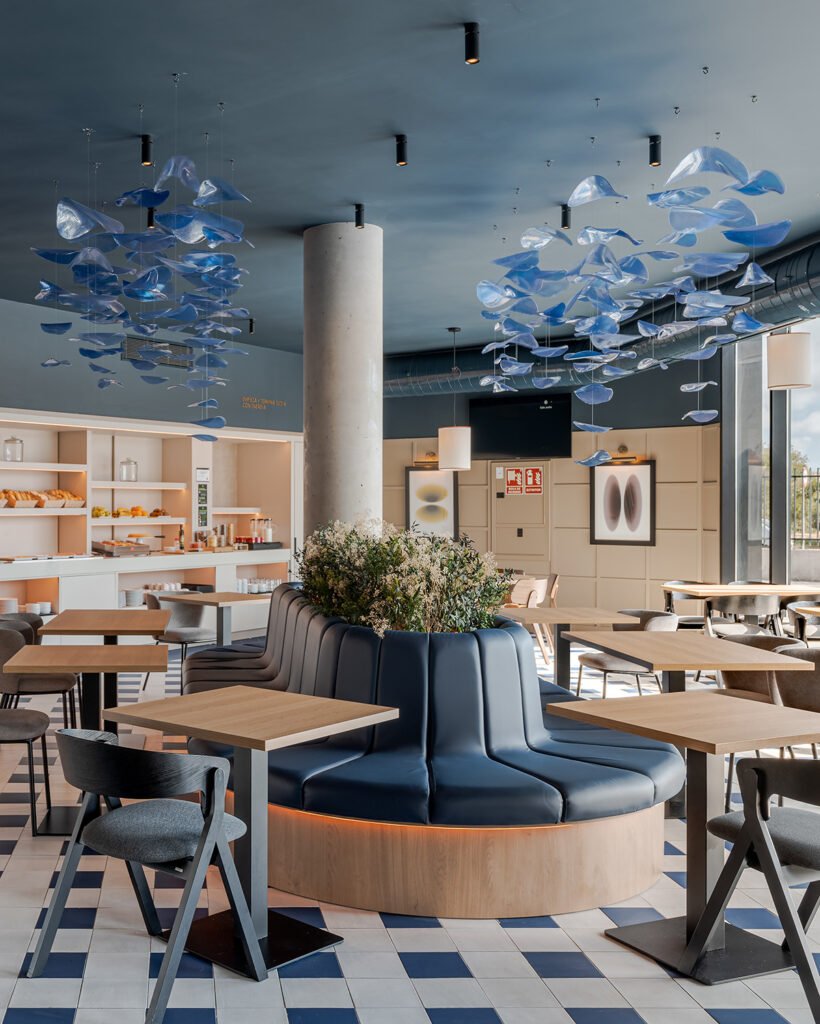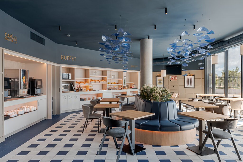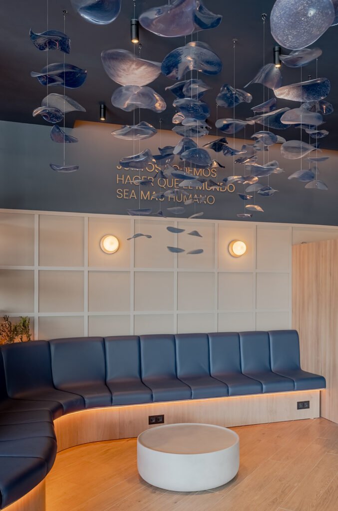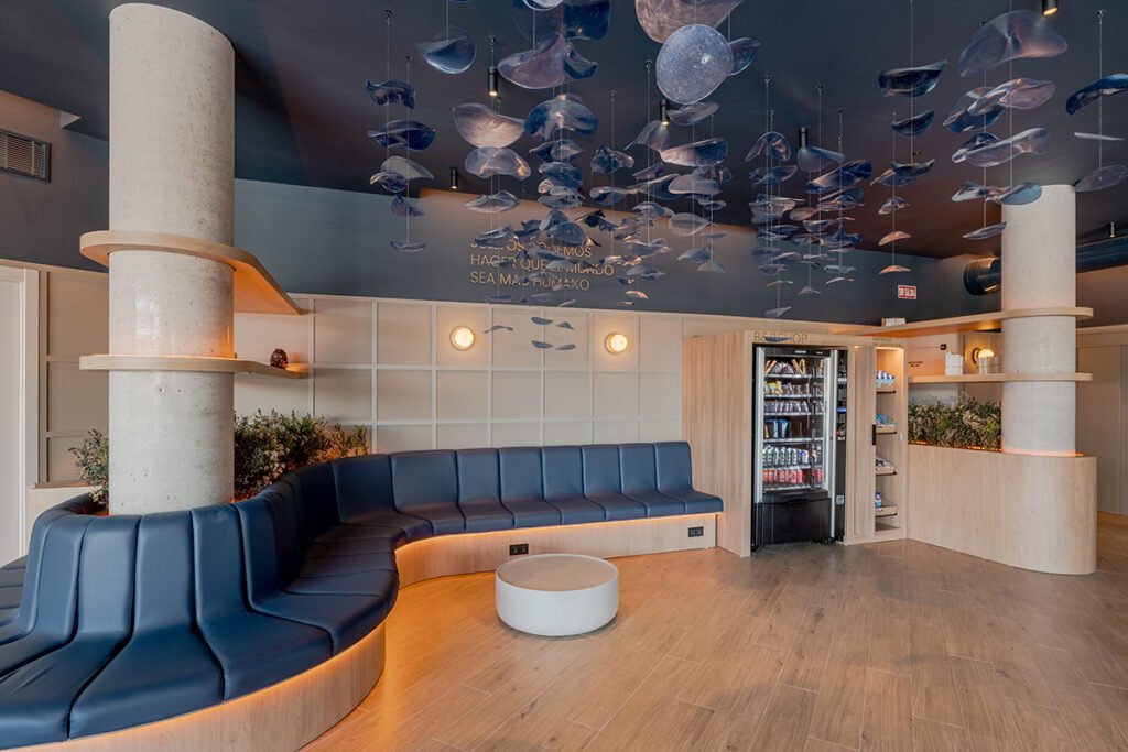 El nuevo hotel B&B abre su sede en Alicante con un interiorismo diseñado por Tres Cinco Uno, quienes buscaban incorporar un gesto visual distintivo en el lobby y la zona de cafetería: una intervención que aportara identidad, calidez y una presencia escultórica capaz de transformar la atmósfera del espacio. Para ello se diseñó una instalación suspendida que evocaría la sensación inmersiva del mar —una referencia simbólica al litoral mediterráneo— utilizando un biomaterial orgánico, ligero y expresivo.
