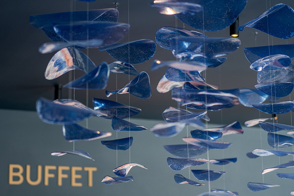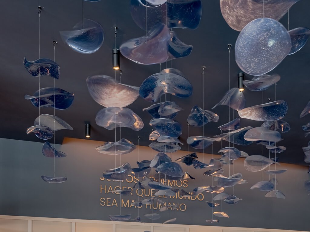 Las piezas, producidas artesanalmente en tres tamaños distintos, se suspenden del techo formando una nube ondulante que recuerda a la superficie del mar vista desde las profundidades.
